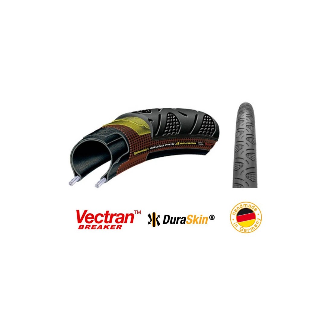 Anvelopa Continental Grand Prix 4-season 25-622 combinatie optima de kilometraj ridicat si functionare la temperaturi scazute. 2 straturi Vectran Breaker si DuraSkin pentru intarirea peretilor laterali  profilul aderent al benzii de rulare rezistenta foarte mare la perforare si durabilitate Hand made in Germany 3 plies / total 330 tpi PSI: 95-120 Double Vectran Breaker Duraskin Greutate 240 grame (cantarita)